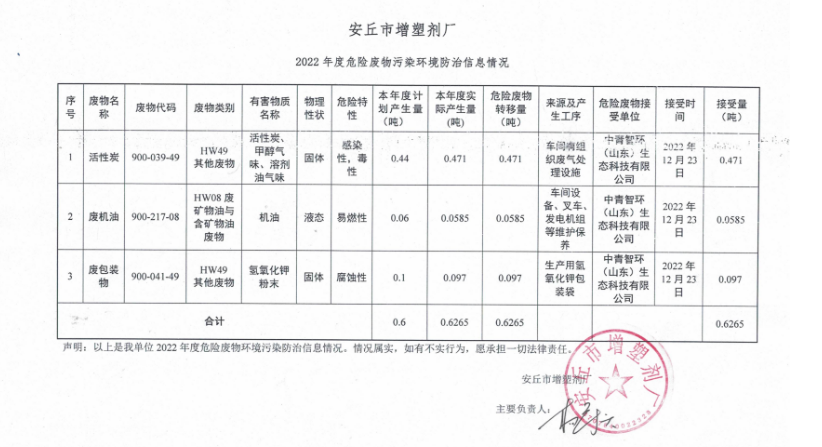 2022年度危險廢物污染環境防治信息情況公示